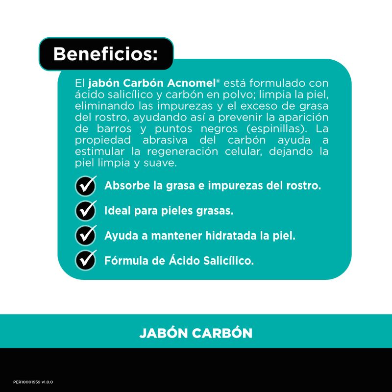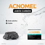 ACNOMEL® JABÓN CARBÓN, formulado con ácido salicílico y carbón en polvo; limpia la piel, eliminando las impurezas y el exceso de grasa del rostro; ayudando así a prevenir la aparición de barros y puntos negros (espinillas). La propiedad abrasiva del carbón ayuda a estimular la regeneración celular, dejando la piel limpia y suave.