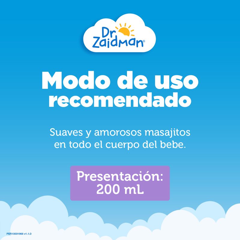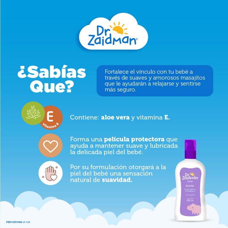 Fortalece el vínculo con tu bebé a través de suaves y amorosos masajitos que le ayudarán a relajarse y sentirse más seguro. El aceite del Dr. Zaidman® con Aloe Vera y Vitamina E, forma una película protectora que ayuda a mantener suave y lubricada la piel de su bebé.