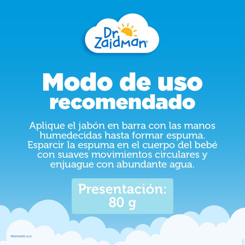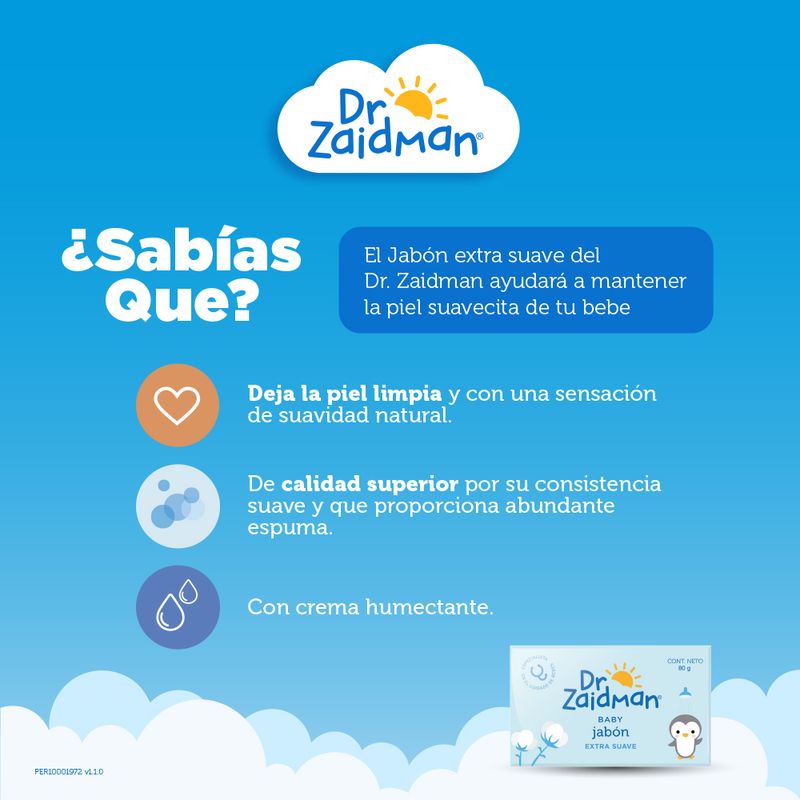 El Jabón para bebés del Dr. Zaidman®, con crema humectante, es de calidad superior por su consistencia suave y que proporciona abundante espuma. Por la fórmula especial de su Crema Humectante, el Jabón para Bebés del Dr. Zaidman® deja la piel limpia y con una sensación de suavidad natural.