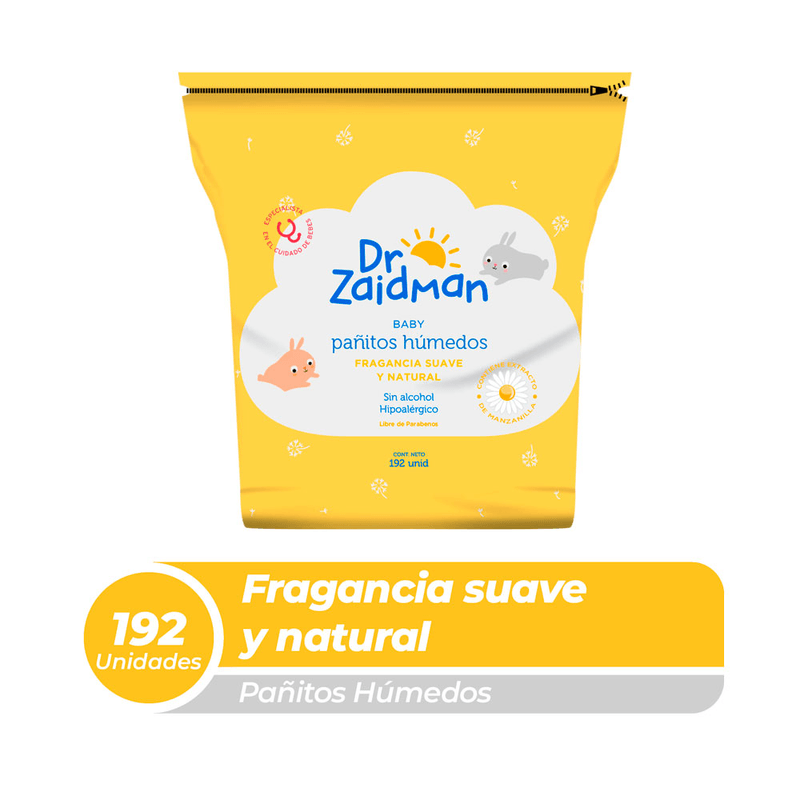 EspecificacionesModo de usoDesglose el cierre hermético, retire su primera toallita, mantenga cerrado luego de usar, úselo en cada cambio de pañal, el baño y en situaciones imprevistas, si el empaque está abierto no acepte el producto.ComposiciónBaby Pañitos Húmedos del Dr. Zaidman® contiene: Aqua; Propylene Glycol; Polysorbate 20; Chlorphenesin; Disodium EDTA; Sodium Citrate; Parfum; Cetylpyridinium Chloride; 2-Bromo-2-Nitropropane-1,3-Diol; Chamomilla Recutita Flower Extract.PresentacionVentaPaquete x192Item destacadosRegistro SanitarioNSOC35561-18PEReceta MedicaRequeridoOTC