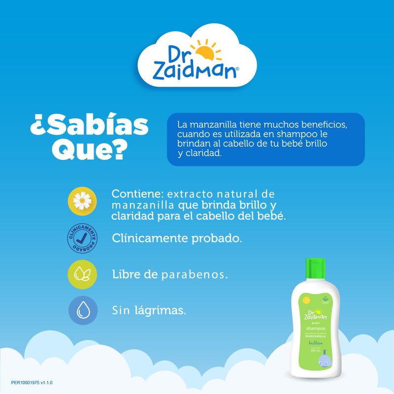 El Shampoo Manzanilla del Dr. Zaidman® tiene como ingrediente principal el extracto natural de manzanilla, cuyas propiedades le darán un brillo y claridad especial al cabello del bebé. No irrita los ojos.