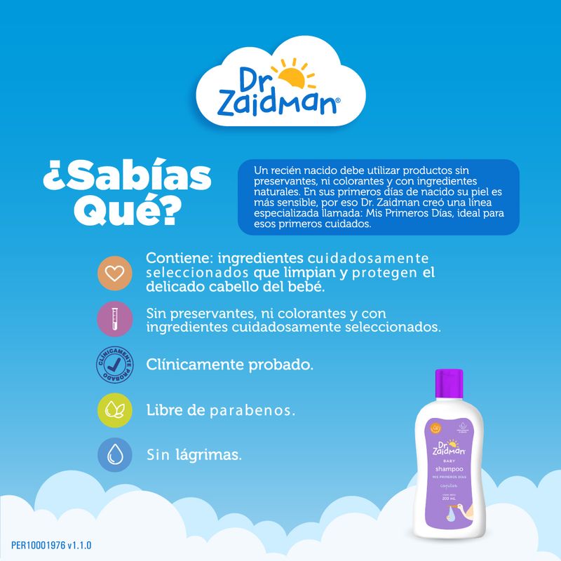 El Shampoo Mis Primeros Días del Dr. Zaidman® es elaborado con ingredientes cuidadosamente seleccionados, que limpian y protegen el delicado cabello de su bebé. Sin Colorantes Artificiales. No irrita los ojos.