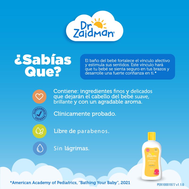 El Shampoo Original del Dr. Zaidman® con finos ingredientes suaves y delicados dejarán el cabello de su bebé más suave, brillante y agradablemente perfumado. No irrita los ojos.
