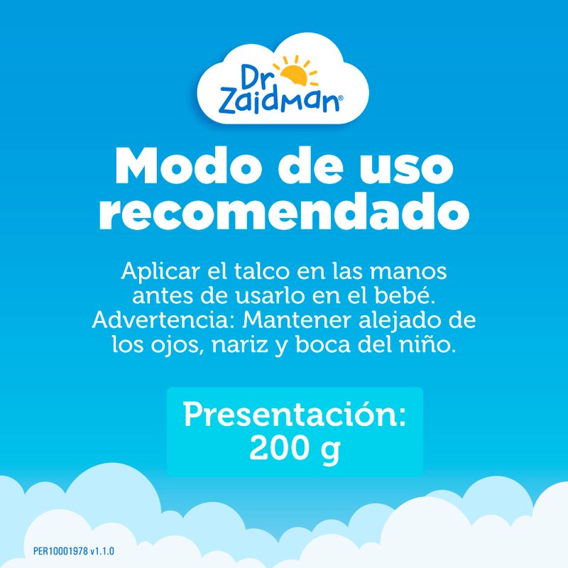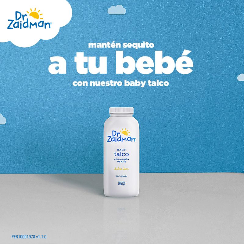 El Talco del Dr. Zaidman® con almidón de maíz, el cual permitirá mantener seca y suave la piel de su bebé. Por su composición permite absorber la excesiva humedad evitando así las molestias que pudiesen presentarse entre los pliegues de la piel del bebé.