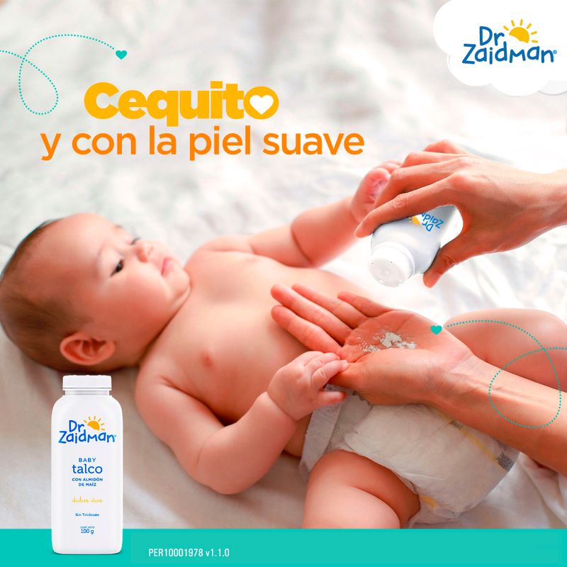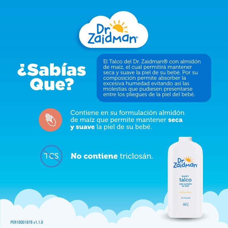 El Talco del Dr. Zaidman® con almidón de maíz, el cual permitirá mantener seca y suave la piel de su bebé. Por su composición permite absorber la excesiva humedad evitando así las molestias que pudiesen presentarse entre los pliegues de la piel del bebé.