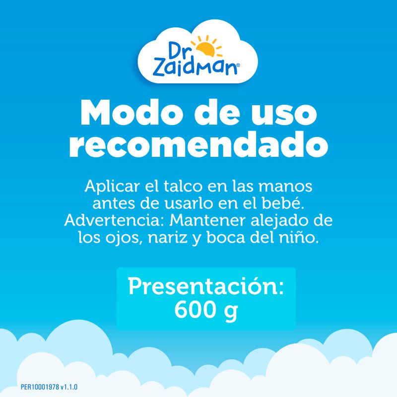 EspecificacionesComposiciónBaby Talco Dr. Zaidman® contiene: Talc, Zea Mays Starch, Magnesium Carbonate, Parfum (Fragrance).PresentacionVentaFrasco 600 gItem destacadosRegistro SanitarioNSOC09024-07PEReceta MedicaRequeridoOTC