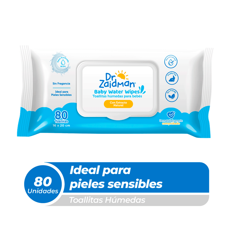EspecificacionesModo de usoAbra la tapa, desglose parcialmente el adhesivo protector, retire su primera toallita, mantenga cerrado luego de usar para una larga duración, úselo en cada cambio de pañal, el baño y en situaciones imprevistas, si el envase o sello de seguridad está abierto no acepte el producto.ComposiciónBaby Water Wipes Dr. Zaidman® contiene: Aqua; Glycine (extracto de cereales naturales); Benzethonium Chloride*.