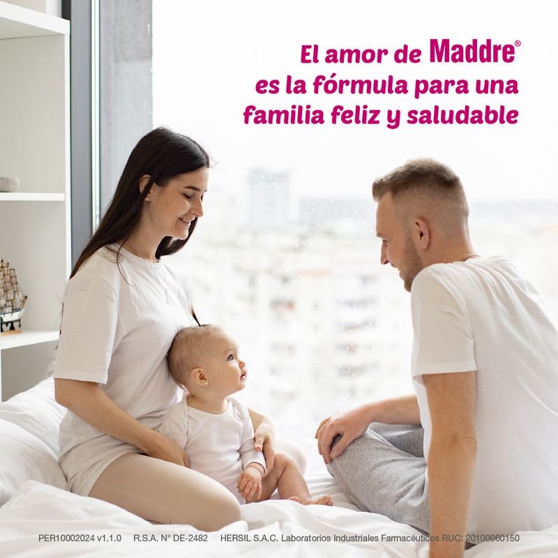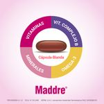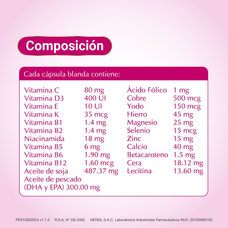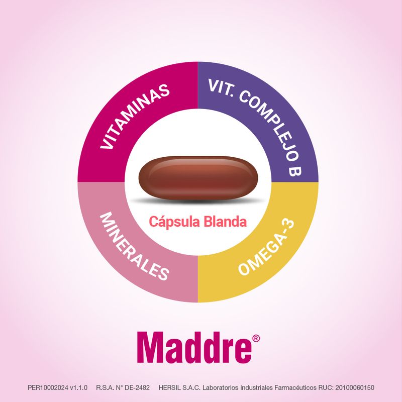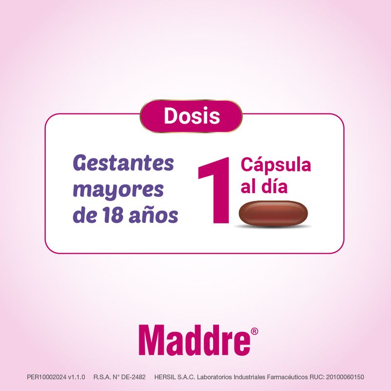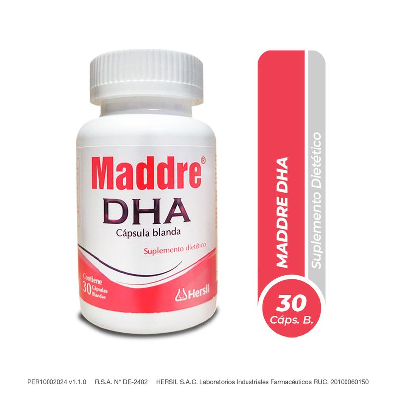 EspecificacionesContraindicacionesNo debe ser consumido por personas alérgicas a cualquiera de los componentes del suplemento. Consulte a su médico antes de tomarlo si tiene alguna condición médica preexistente.Modo de usoGestantes mayores de 18 años: 1 cápsula al día. No superar la dosis diaria recomendada para productos dietéticos.ComposiciónMADDRE® DHA CÁPSULAS BLANDAS contiene: Vitamina C 80 mg, Vitamina D3 400 UI, Vitamina E 10 UI, Vitamina K 35 mcg, Vitamina B1 1.4 mg, Vitamina B2 1.4 mg, Niacinamida 18 mg, Vitamina B5 6 mg, Vitamina B6 1.90 mg, Vitamina B12 1.60 mcg, Aceite de soya 487.37 mg, Aceite de pescado (DHA y EPA) 300 mg, Ácido Fólico 1 mg, Cobre 500 mcg, Yodo 150 mcg, Hierro 45 mg, Magnesio 25 mg, Selenio 15 mcg, Zinc 15 mg, Calcio 40 mg, Betacaroteno 1.5 mg, Cera 18.12 mg, Lecitina 13.60 mg.PresentacionVentaFrasco x30Item destacadosRegistro SanitarioDE-2482Receta MedicaRequeridoOTC