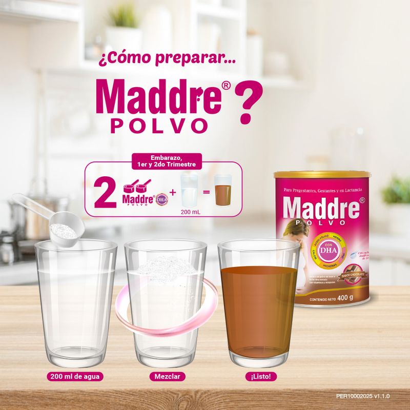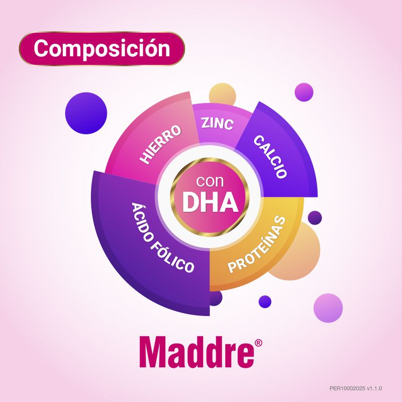 Maddre® DHA es un complemento alimenticio en polvo especialmente formulado para cumplir con los requerimientos nutricionales de la mujer que está gestando o dando de lactar. Complemento nutricional y vitamínico ideal para el consumo en la etapa de la pre-gestación, gestación y lactancia, ya que aporta macro y micronutrientes. Proporciona un aporte adicional de proteínas de alto valor biológico, carbohidratos, vitaminas, minerales, ácido fólico, hierro, calcio y zinc.
