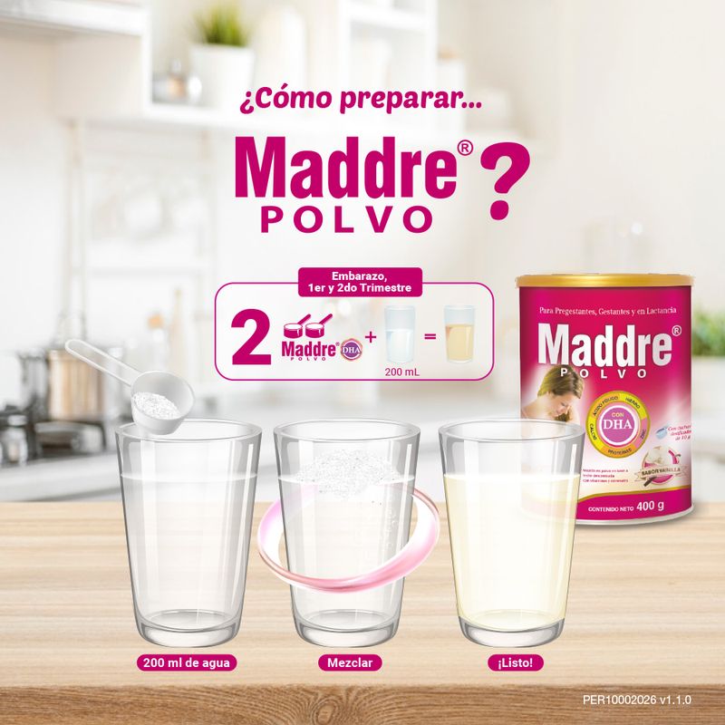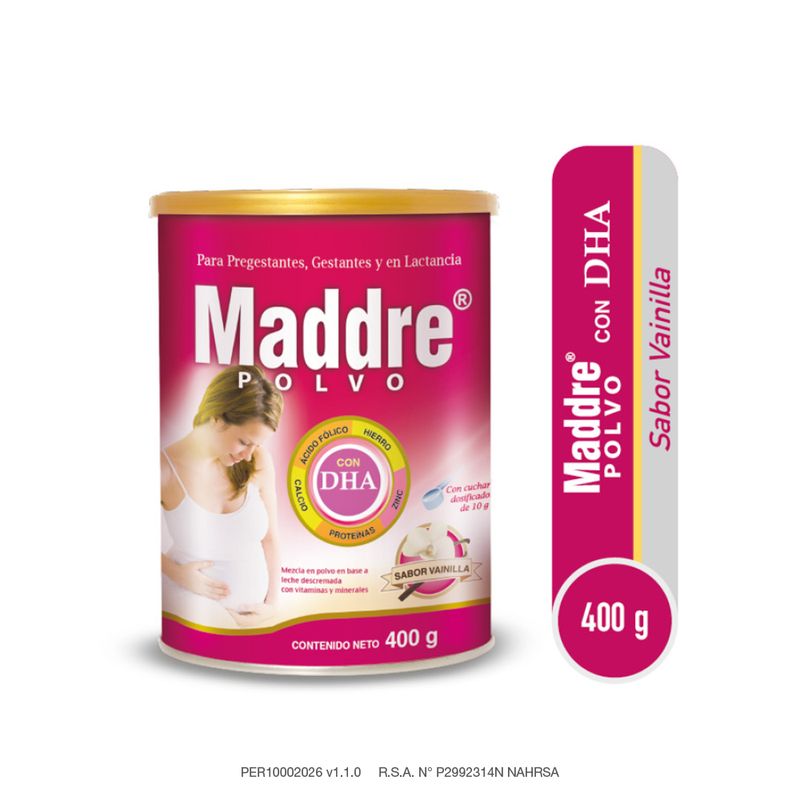 EspecificacionesModo de usoMaddre® DHA es de agradable sabor a vainilla y de fácil disolución, puede administrarse con líquidos o alimentos blandos: leche, agua, avena, postres y jugos. Una vez preparado el producto puede observarse en el fondo del envase un sedimento oscuro propio del producto que corresponde a las sales minerales que contiene. Diluir la cantidad requerida en 200 mL de líquido. Libre de gluten. Embarazo: 1er y 2do trimestre: 2 cucharadas; 3er trimestre: 3 cucharadas. Lactancia: 3 cucharadas.ComposiciónMADDRE® DHA contiene: Leche descremada en polvo, Premezcla de Vitaminas y Minerales [Fosfato tribásico de calcio, Dióxido de silicio amorfo SIN 551, Ascorbato de sodio, Fumarato Ferroso, Gluconato de Zinc, Vitamina E (Alfatocoferol), Nicotinamida, Vitamina D3, Pantotenato de Calcio, Vitamina A, Vitamina B12 (Cianocobalamina), Vitamina B6 (Piridoxina clorhidrato), Vitamina B1 (Tiamina mononitrato), Vitamina B2 (Riboflavina), Ácido fólico, Butilhidroxitolueno SIN 321], Sacarosa, Aceite refinado de pescado (DHA, EPA), Sabor natural a leche, Saborizante sintético artificial leche condensada, Antioxidante: Mezcla de tocoferoles SIN 307b, Vainillina, Edulcorante: Sucralosa SIN 955. Contiene leche y pescado.PresentacionVentaLata 400 gItem destacadosRegistro SanitarioP2992314N NAHRSAReceta MedicaRequeridoOTC