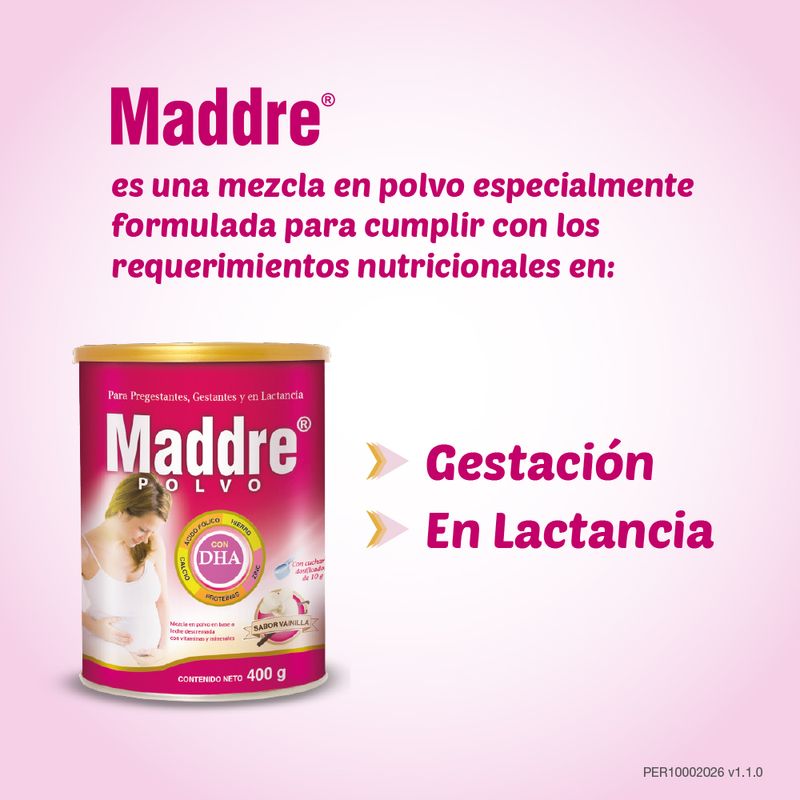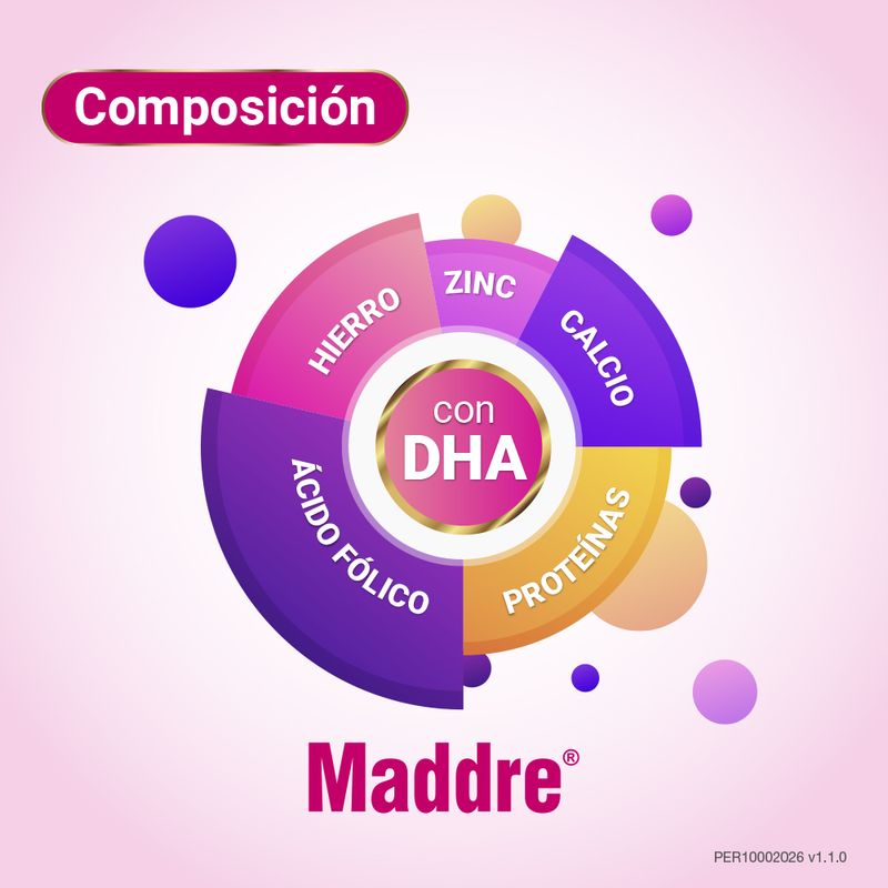 Maddre® DHA es un complemento alimenticio en polvo especialmente formulado para cumplir con los requerimientos nutricionales de la mujer que está gestando o dando de lactar. Complemento nutricional y vitamínico ideal para el consumo en la etapa de la pre-gestación, gestación y lactancia, ya que aporta macro y micronutrientes. Proporciona un aporte adicional de proteínas de alto valor biológico, carbohidratos, vitaminas, minerales, ácido fólico, hierro, calcio y zinc.