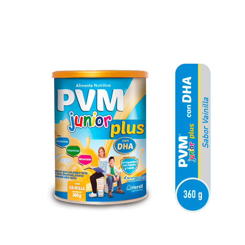 PVM® JUNIOR PLUS, reforzado con DHA, es un complemento nutricional diseñado para proporcionar a los niños una mayor cantidad de proteínas, vitaminas y minerales esenciales, con el objetivo de complementar su nutrición y favorecer su crecimiento y desarrollo.