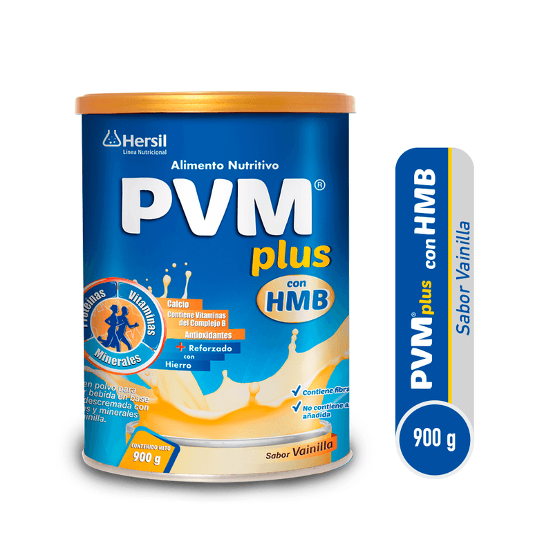 EspecificacionesContraindicacionesPVM® Plus está contraindicado en personas con hipersensibilidad a alguno de sus componentes.Modo de usoPVM® plus es de fácil disolución y administración cuando se prepara adecuadamente. Puede adicionarse a la leche, avena, jugos y también tomarse como bebida helada tipo “milkshake”. Modo de uso: Para adultos: Agregar en 200 mL de leche 3 cucharas de medida o 30 g de PVM® plus en polvo una vez al día hasta que el contenido se disuelva completamente. La cuchara de medida (10 g) se incluye en la lata. La presencia de puntos de color en el producto es normal y se debe a los ingredientes que contiene la fórmula. PVM® plus está disponible en dos agradables sabores: vainilla y chocolate.ComposiciónPVM® Plus contiene: Leche descremada en polvo, Maltodextrina, Fructooligosacáridos, Premezcla de Vitaminas y Minerales (Fosfato Tribásico de calcio, Ascorbato de sodio, Dióxido de silicio SIN 551, Gluconato Ferroso dihidratado, Gluconato de Zinc, Vitamina E (a-tocoferol), Nicotinamida, Vitamina D3, Vitamina A, Pantotenato de Calcio, Vitamina B12 (Cianocobalamina), Vitamina B6 (Piridoxina clorhidrato), Vitamina B1 (Tiamina Clorhidrato), Vitamina B2 (Riboflavina), Ácido fólico, Mezcla de tocoferoles SIN 307b), ß-hidroxi-ß metilbutirato de Calcio (CaHMB), Saborizante artificial vainilla francesa, Antioxidante: Mezcla de tocoferoles SIN 307b, Edulcorantes: Sucralosa SIN 955 y Sacarina sódica SIN 954(iv). Contiene leche.PresentacionVentaLata 900 gItem destacadosRegistro SanitarioP2958418N NAHRSAReceta MedicaRequeridoOTC