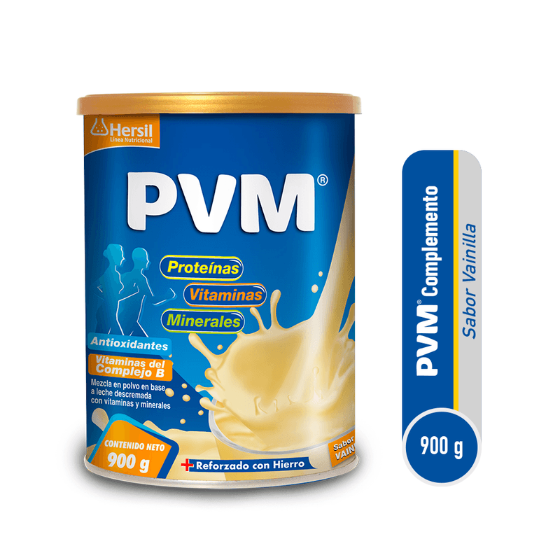 EspecificacionesContraindicacionesContraindicado en casos de hHipersensibilidad a alguno de sus componentes. No recomendado para personas con intolerancia a la lactosa.Modo de usoPVM® es de fácil disolución y administración cuando se prepara adecuadamente. Puede adicionarse a la leche, agua, avena, postres, jugos y también tomarse como bebida helada tipo “milkshake”. Modo de uso: para adultos mayores de 18 años disolver en 200 mL de su bebida de preferencia de 1 a 3 porciones de 10 g una vez al día. PVM® está disponible en tres agradables sabores: vainilla, fresa y chocolate. La presencia de puntos de color en el producto es normal y se debe a los ingredientes que contiene la fórmula. Guardar en lugar fresco y seco. Mantenerse fuera del alcance de los niños. Libre de gluten.ComposiciónPVM® Contiene: Leche descremada en polvo, Sacarosa, Fosfato tribásico de calcio, Premezcla de Vitaminas y Minerales [Contiene: Fosfato tribásico de calcio, Ascorbato de sodio, Antiaglutinante: Dióxido de silicio amorfo SIN 551, Gluconato Ferroso Dihidratado, Gluconato de Zinc, Vitamina E (Alfatocoferol) al 50%, Nicotinamida, Vitamina D3 100 000 UI/g, Vitamina A 500 000 UI/g, Pantotenato de Calcio, Vitamina B12 (Cianocobalamina) al 0.1%, Vitamina B6 (Piridoxina clorhidrato), Vitamina B1 (Tiamina clorhidrato), Vitamina B2 (Riboflavina), Ácido fólico, Antioxidante: Butilhidroxitolueno SIN 321], Aroma sintético artificial leche condensada, Vainillina, Edulcorante: Sacarina sódica SIN 954 (IV). Contiene Leche.PresentacionVentaLata 900 gItem destacadosRegistro SanitarioA3500113N NAHRSAReceta MedicaRequeridoOTC