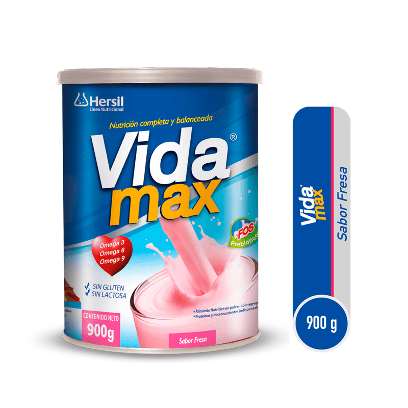 EspecificacionesModo de usoPara obtener una porción aproximada de 250 mL, utilice un recipiente con 200 mL de agua hervida fría, agregue una medida tras otra mezclando al mismo tiempo hasta completar seis medidas al ras (la cucharada de medida se incluye dentro de la lata) ó 52 g de Vidamax® en polvo una toma al día hasta que el contenido se disuelva completamente. Vidamax® proporciona 0,9 cal/mL cuando ha sido preparado según se recomienda. Una lata de 400 g de polvo proveerá aproximadamente ocho porciones de 250 mL. Para alimentación por sonda se sugiere seguir las instrucciones del médico tratante, nutricionista o profesional de la salud encargado de su dieta. El flujo, volumen y dilución dependen de la tolerancia y de las condiciones de cada persona. Se sugiere tomar precauciones necesarias al preparar y administrar este producto y evitar su contaminación. Una vez abierta la lata, cubrir adecuadamente el envase y almacenar a temperatura no mayor de 30°C (NO en el refrigerador). VidaMax® reconstituido se deberá consumir con prontitud o guardarse refrigerado no más de 12 horas y removerse previo a su consumo. Se sugiere consumir el contenido dentro de las tres semanas después de haber abierto el envase.ComposiciónVidaMax® POLVO SABOR FRESA contiene: Sacarosa, Harina de Soya, Aceites Vegetales, Maltodextrina, Fructooligosacáridos (FOS), Dióxido de silicio, Lecitina, Cloruro de potasio, Cloruro de sodio, Carbonato de calcio, Saborizante fresa, Goma xantana, Bitartrato de colina, Sulfato de magnesio, Fosfato de magnesio, Ácido ascórbico, Molibdato de sodio, Sucralosa, Vitamina E acetato, Niacinamida, Colorante rojo E-124, Sulfato de zinc, D-pantotenato de calcio, Sulfato ferroso, Sulfato de manganeso, Piridoxina clorhidrato, Riboflavina, Tiamina mononitrato, Óxido cúprico, Vitamina A acetato, Ácido Fólico, Iodato de potasio, Cloruro de cromo, Selenito de sodio, Fitomenadiona, Biotina, Cianocobalamina, Colecalciferol.PresentacionVentaLata 900 gItem destacadosRegistro SanitarioE5003912N NAHRSAReceta MedicaRequeridoOTC